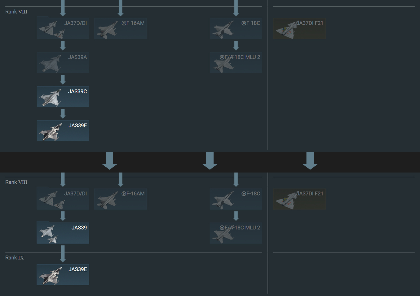 , we’ll be introducing rank IX for aircraft research trees. This rank will include some existing top-tier aircraft, while some rank VIII aircraft will be grouped or relocated. Comparison images of the trees before and after the changes can be seen below. Check them out!
