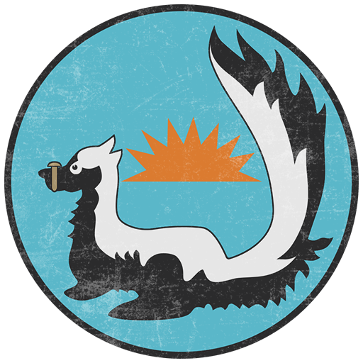 The emblem of the 3rd Bomb Squadron, 1st Bomb Group, Chinese-American Composite Wing (Provisional). The 3rd Squadron was the final bomb squadron to be formed during World War 2, in February 1944. It was jointly commanded by Major Lee Hsueh-yen and Colonel John A. Hilger, and boasted a formidable combat record for its relatively short operational period. The emblem was designed by John Hinrichs Jr, the supply officer of the squadron. It prominently depicts a skunk in front of the rising sun, along with a peg on its nose to keep it safe from its own defense mechanism. It was derived from the motto of the squadron, “Spray and Pray,” which reflected their combat duties of strafing Japanese positions with their heavily armed B-25 aircraft. They operated several Mitchell variants, with the emblem often painted to the sides of the nose towards the front.