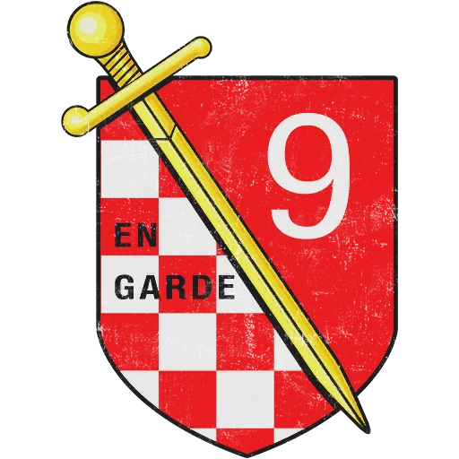 The emblem of Destroyer Squadron 9, United States Navy. The squadron was first formed in 1920 with early four-piper destroyers, and operated until 1930 when it was decommissioned temporarily. It was later reactivated in 1937, equipped with Porter and Somers class destroyers, including USS Davis, Moffett and Somers, and saw action in both the Atlantic and Pacific. The squadron took part in many operations after the Second World War as well, including the Korean War and Desert Storm, and currently operates the Arleigh Burke-class. The badge of the squadron prominently portrays naval military strength and honor, with the famous phrase “En garde” conveying the sentiment “get ready to fight!”.