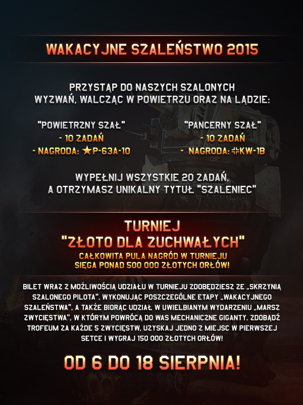 Każdego dnia postawimy przed Wami po jednym zadaniu dla sił powietrznych oraz naziemnych, za wykonanie których otrzymacie „Trofea szaleństwa”, które zawierać będą bilety na turniej „Złoto dla zuchwałych”, pojazdy premium i inne nagrody. Jeśli wykonasz wszystkie 20 zadań, otrzymasz niepowtarzalny tytuł Szaleńca!