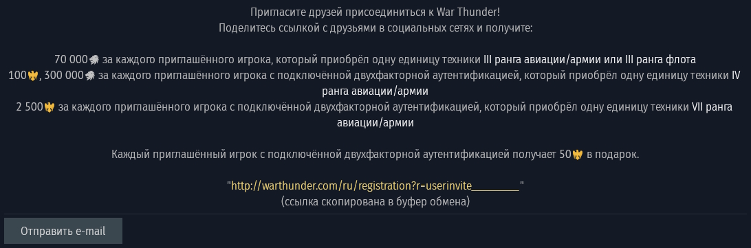 Для этого необходимо пригласить в игру друга, который ещё не зарегистрирован в War Thunder, отправив ему специальную ссылку. Пройдя по ней, он должен зарегистрировать учётную запись и подключить двухфакторную аутентификацию. По мере того, как приглашённый будет исследовать технику новых рангов, вам будут приходить различные награды и бонусы.