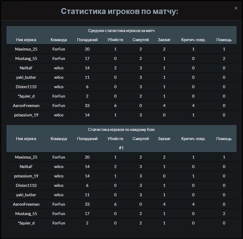 Кроме подробной информации о матче, которая содержит информацию о миссии, погоде, времени суток, настройках сложности можно ознакомиться и с со статистикой матча: сколько было попаданий по сопернику, сколько было захватов точек, убийств и смертей у каждого игрока.